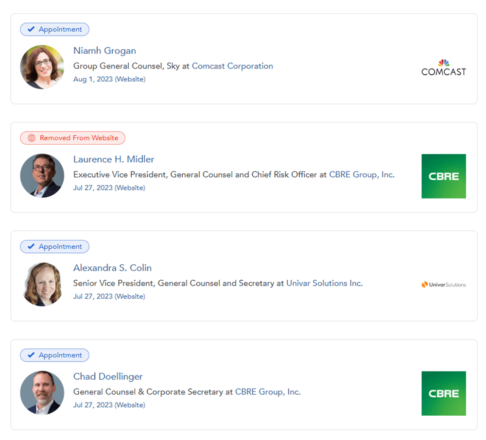 Relationships power the legal services industry. Establishing connections is merely the first step; nurturing them is vital to sustaining open avenues to future business opportunities. ExecAtlas detects role changes in real time by monitoring SEC filings and corporate websites. These signals can power automated workflows that deepen client engagement, all within one datafeed: